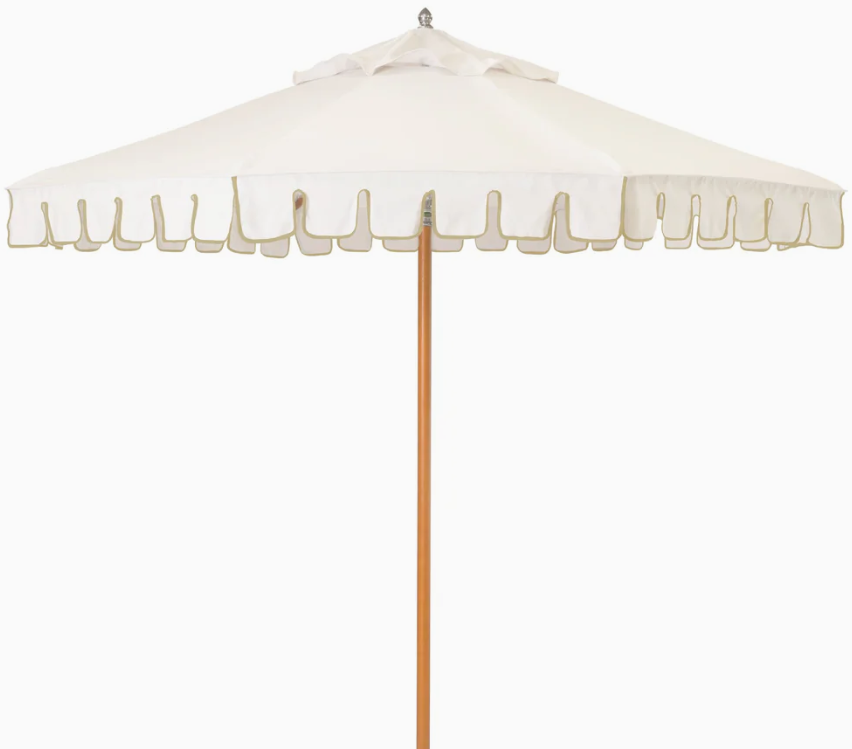 Beach patio market umbrella aluminum frame in wood grain finish beige fabric with piping scalloped umbrella for outdoor