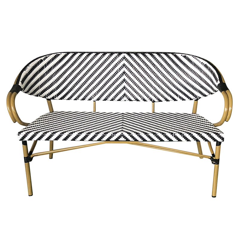 Custom-made  restaurant  furniture french style bistro aluminum frame white/blue rattan woven 2 seater sofa bench stool with armrest for bar