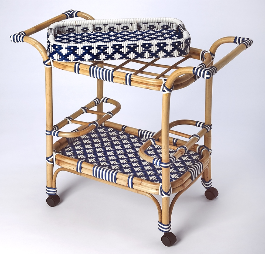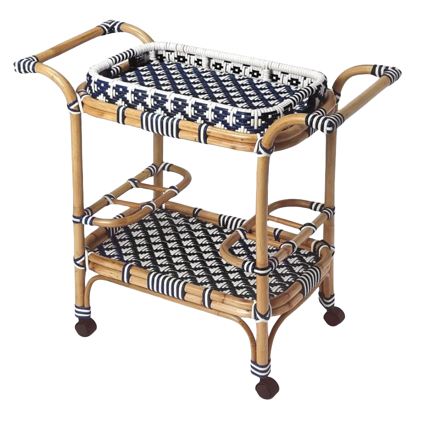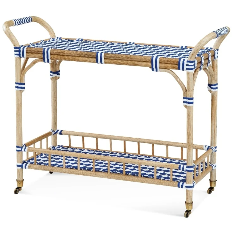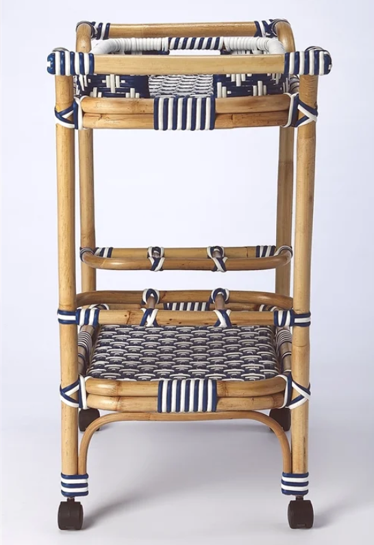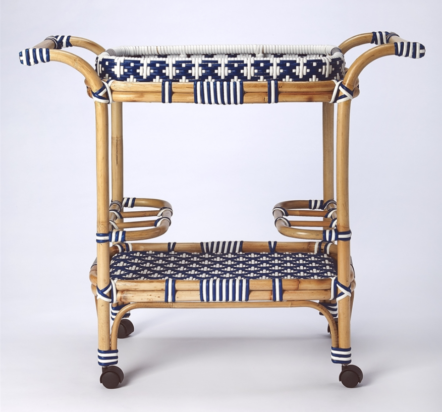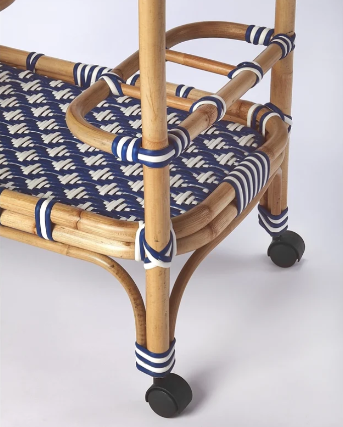 Bar Cart is bistro inspired with a top and bottom shelf and casters for function. Finish: natural, blue and white. Material: rattan
