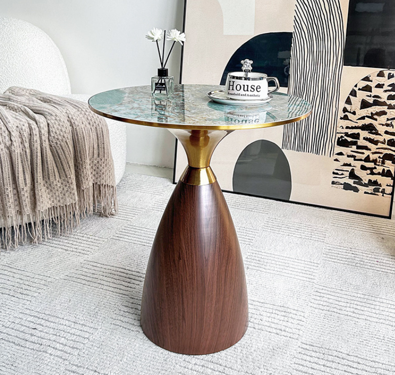 Material: Sintered stone top, gold stainless steel central pole, metal base with wood grain finish