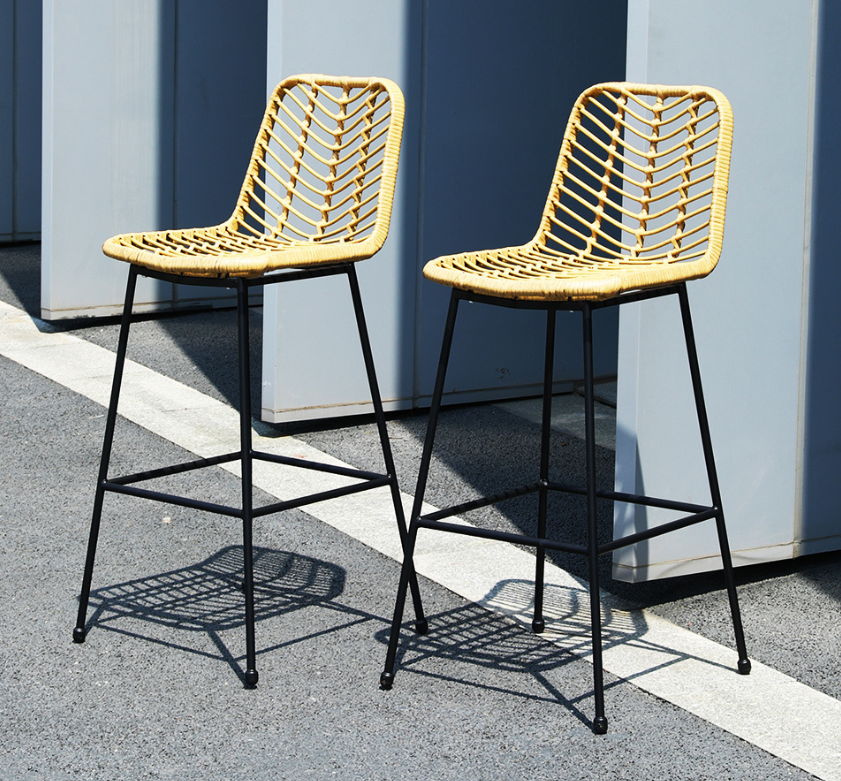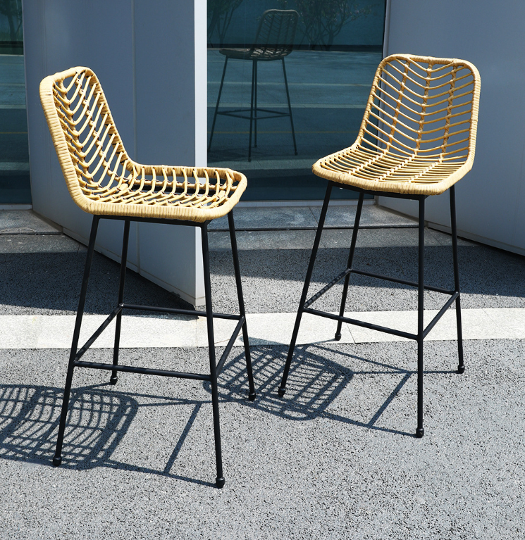 Outdoor hospitality furniture bistro rattan stool black metal frame rattan woven high bar chair with seat cushion