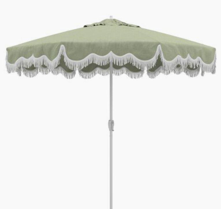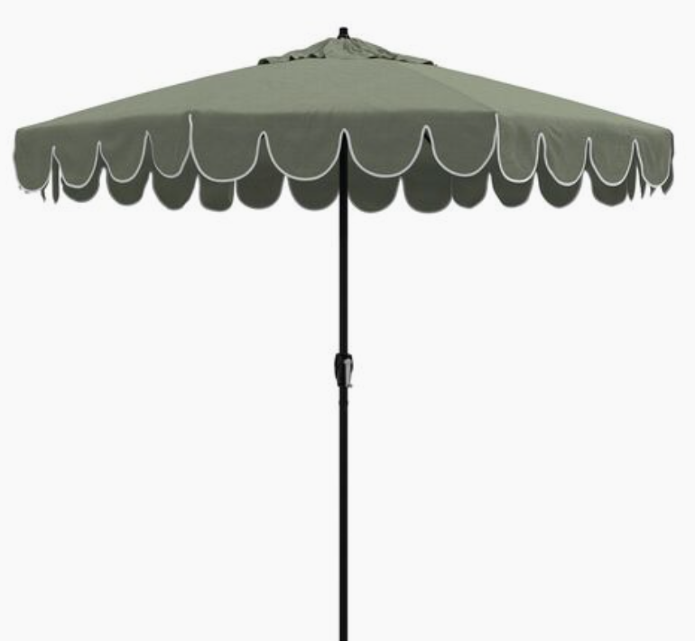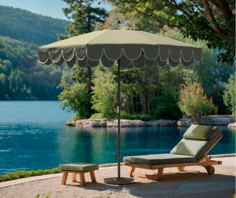 Outdoor market umbrella black aluminum frame green fabric with white trim scalloped Patio Umbrella
