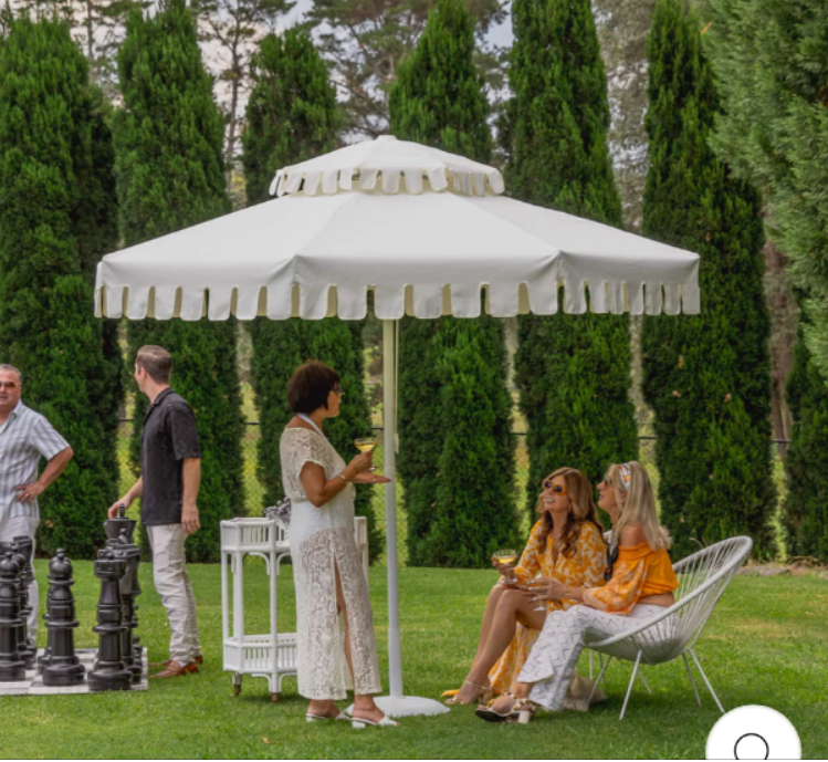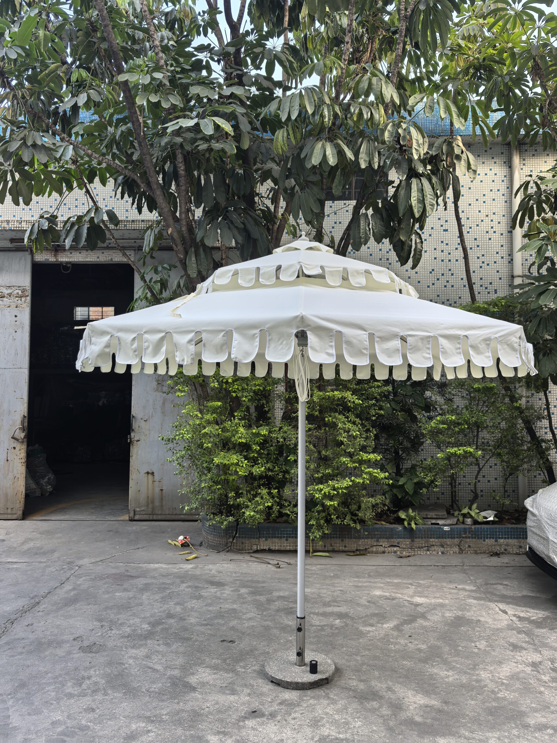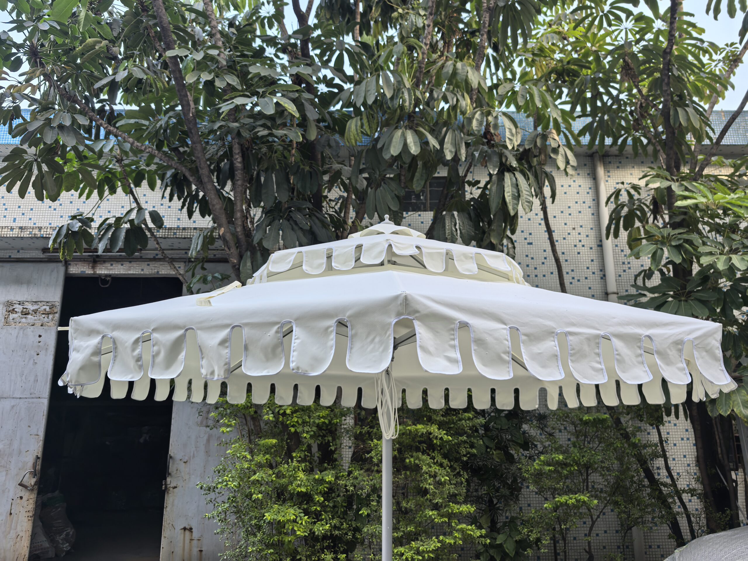 Outdoor Patio double scalloped Umbrellas aluminum frame yellow fabric white trim double wavy parasol central column circular Sun Umbrella for outdoor